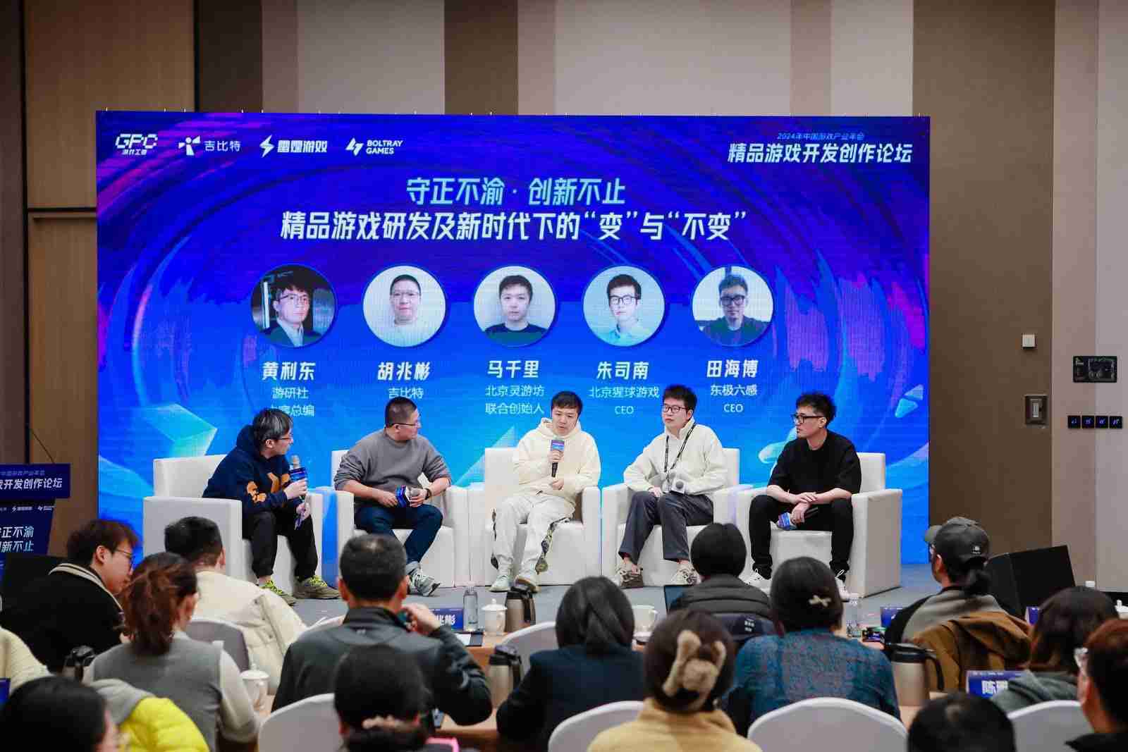 圆桌对话环节,,在游研社内容总编黄利东的主持下,,亚星管理CTO胡兆彬、、北京灵游坊联合创始人马千里、、北京猩球游戏CEO朱司南、、、、东极六感CEO田海博等四位嘉宾围绕“守正不渝、、、创新不止——精品游戏研发及新时代下的‘变’与‘不变’”这一主题分享了各自在精品游戏开发理念及工程能力搭建方面的见解和经历,,,,并就行业变化下游戏人需要坚守的理念等展开交流探讨。。。