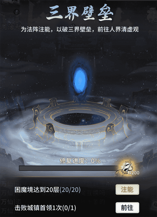 当你修为达到返虚/破虚中期后,,,可在城镇寻得芸丫并激活神秘法阵,,,通过收集材料、、、击败首领等方式为法阵注能,,,,借以打破三界壁垒,,开启支线剧情“清虚旧梦”