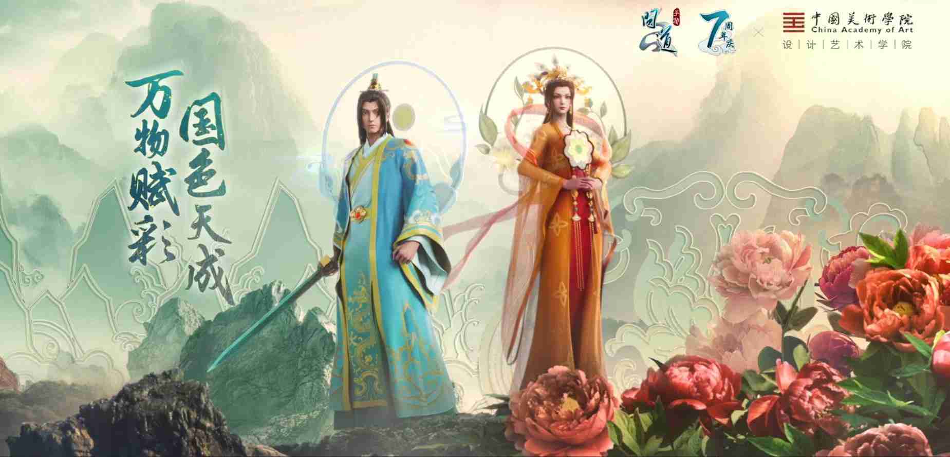 2023年4月,,,《问道手游》联动中国美术学院,,,在游戏中融合了中国历史上不同时期的文化元素,,打造了“山河万象”与“凤鸣九霄”的国风时装。。在色彩配置方面,,创作团队基于对游戏角色特性的分析提取相应的文化内涵,,从每一种色彩的色相、、、、指代事物和情感出发对应角色属性,,选定服装的色彩搭配。。在纹样设计方面,,,创作团队结合游戏角色自身特殊的造型比例和形态,,在实际的纹样设计中进行了游戏语境下的活化演绎。。。男性角色集中使用了如蟒纹、、、、海水江崖纹、、如意纹和云气纹等传统纹样元素,,,,女性角色则吸纳了凤凰纹、、、、牡丹纹、、、、卷草缠枝纹等元素,,,组成以“双凤牡丹纹样”“缠枝牡丹纹”“金玉凤冠头饰”为主要纹样的游戏角色装饰图案系统。。。。