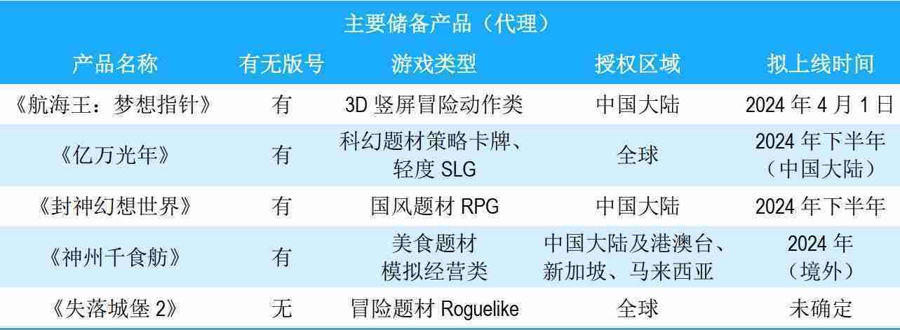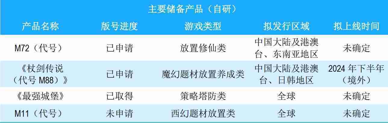 公司储备的多个自研、、代理产品都在有序推进当中,,,涵盖放置类、、、、策略类、、模拟经营类、、、RPG、、Roguelike等多元化游戏品类,,,储备的主要自研和代理产品如下::::